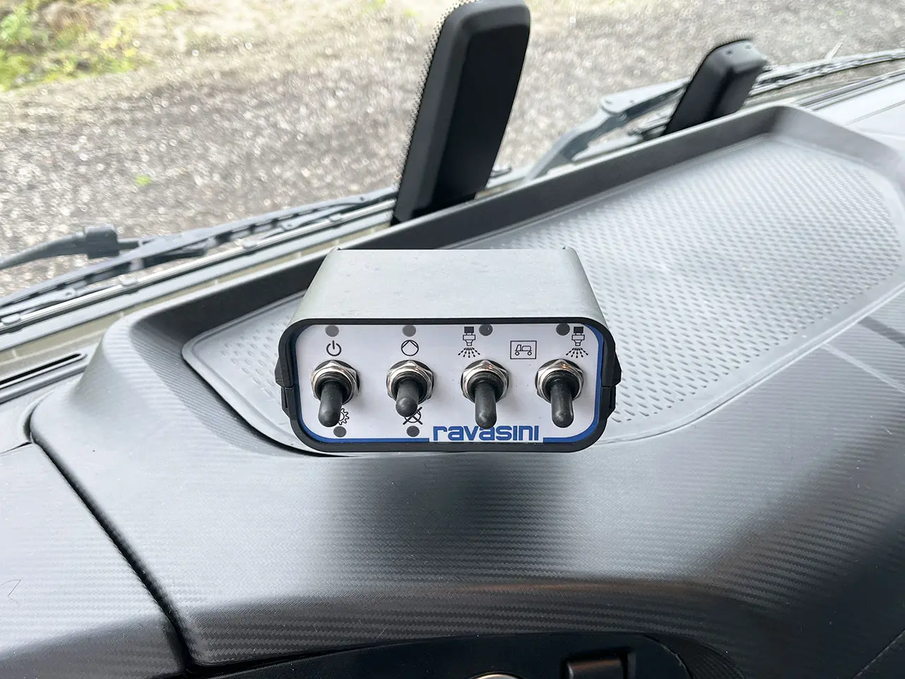 Sprinklers with flat spraying nozzles mounted on front and rear end of the vehicle the bars function separately or on the same time.