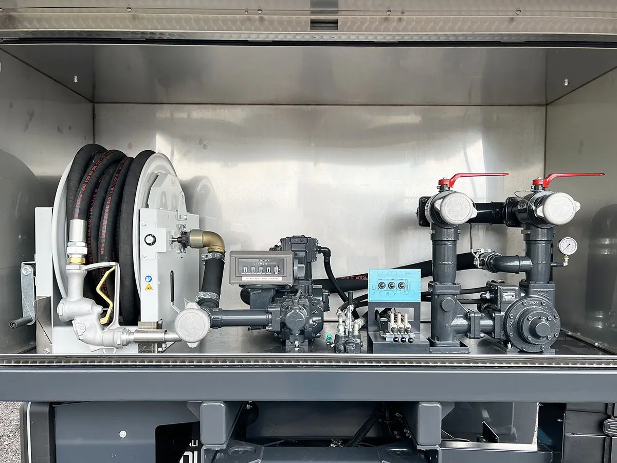 Pumping and metering units placed inside a lockable metallic case on the rear end of the vehicle.