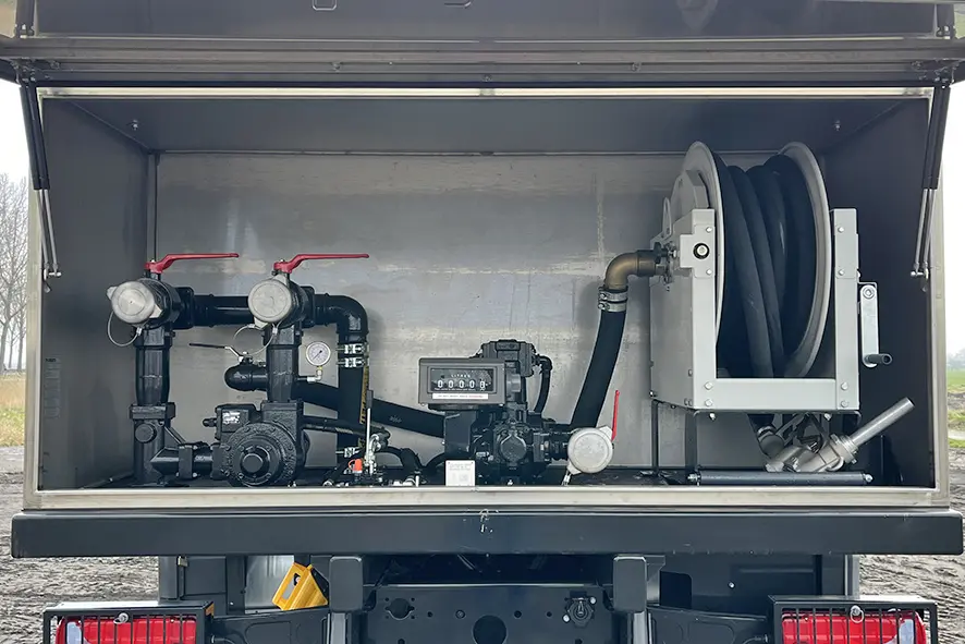 Pumping and metering units placed inside a lockable metallic case on the rear end of the vehicle.